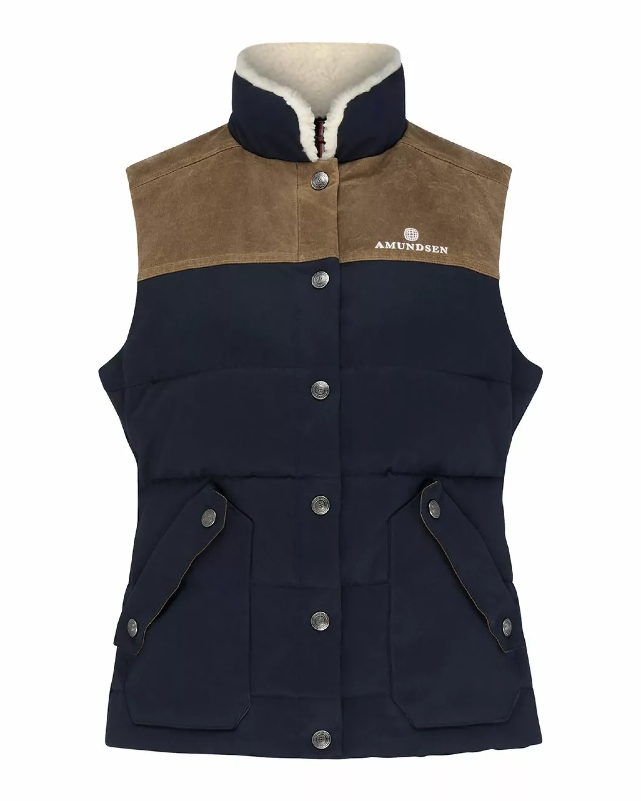 This puffy vest in recycled down and rugged waxed herringbone cotton offers premium warmth. The front of the garment features two patched hand-warming pockets, with a polar fleece-lined collar for ultimate comfort.